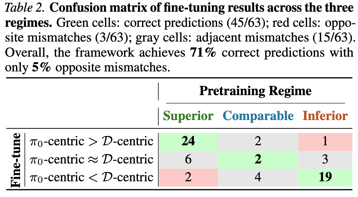 Across all 63 settings, the answer is largely yes. The framework makes the correct qualitative prediction in 45 out of 63 cases (71%). Only 3 cases (5%) show an opposite outcome and the remaining mismatches are adjacent. Imperfect accuracy is expected, given the influence of hyperparameters, implementation details, and the use of a simple raw-return metric for regime classification.