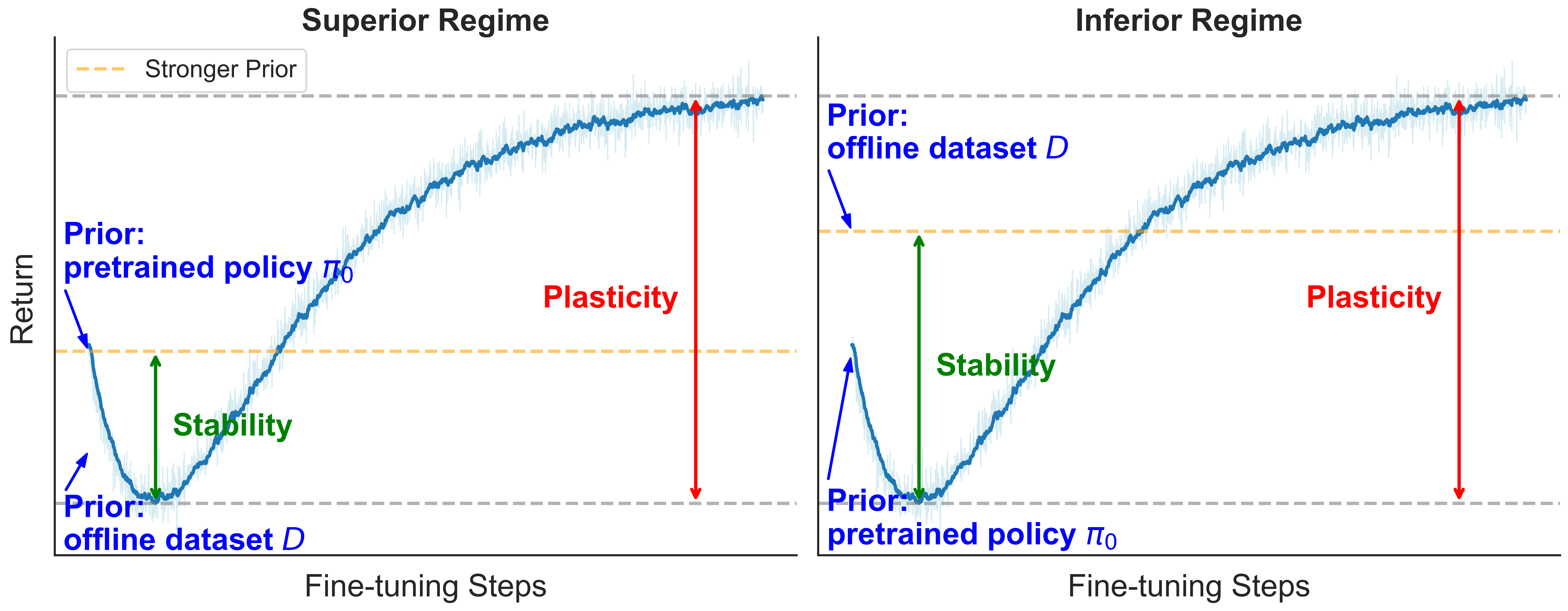 Intuitively, stability limits how far performance is allowed to fall, while plasticity determines how much the agent can recover and improve. Fine-tuning methods differ primarily in how they trade off these two effects.