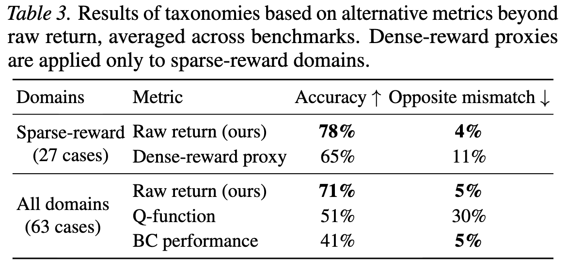 that alternative metrics such as dense reward proxies, Q-values, or behavior cloning performance