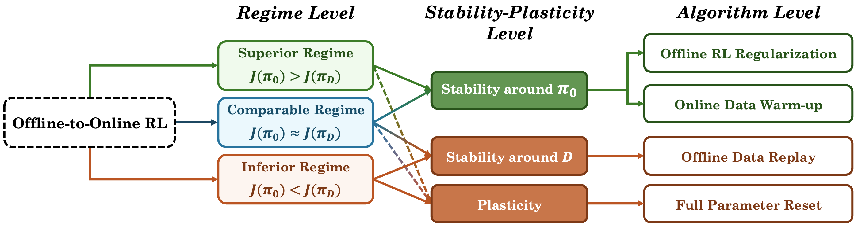 $$ \boxed{ \underbrace{\max_{0\le n\le N} J(\pi_n)}_{\text{Final knowledge}} = \underbrace{J^*_{\text{off}}}_{\text{Prior knowledge}} + \underbrace{\text{Stability}(J^*_{\text{off}})}_{\text{Degradation} \le 0} + \underbrace{\text{Plasticity}}_{\text{ Online gain} \ge 0}. }$$