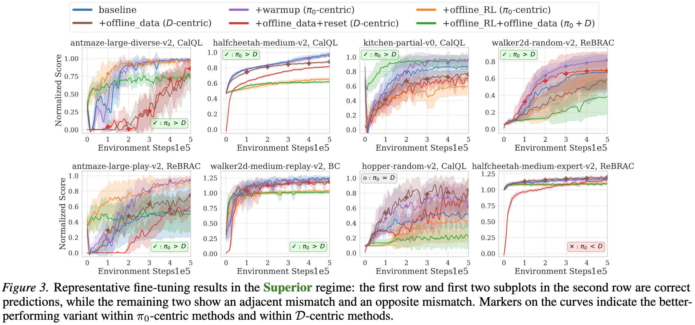 In the Superior regime, where the pretrained policy $\pi_0$ substantially outperforms the offline dataset $\mathcal D$, $\pi_0$-centric methods are typically more effective than $\mathcal D$-centric methods. Stronger stability proves beneficial primarily when $\pi_0$ is already close to optimal.