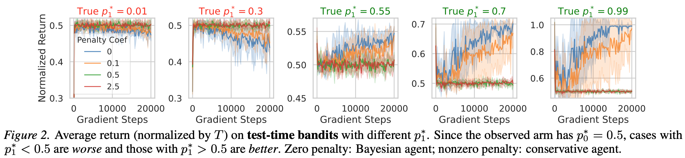 Summary. The common failure mode of conservatism is the same: avoiding uncertainty too early during offline training (e.g., the SFT stage), rather than allowing uncertainty to be resolved later through test-time scaling or RL fine-tuning.
