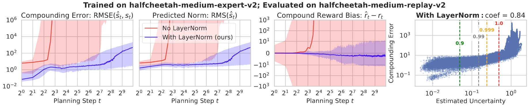 Interestingly, even though model errors remain noticeable over long horizons, we still obtain good policy performance when using long-horizon rollouts. This suggests that policy optimization does not require highly accurate long-term predictions from any single world model. Instead, robustness to model error appears to be supported by ensembles that capture diverse plausible world models, allowing policies to generalize to the real environment. For readers interested in algorithmic details and full experimental results, we refer to the original paper.