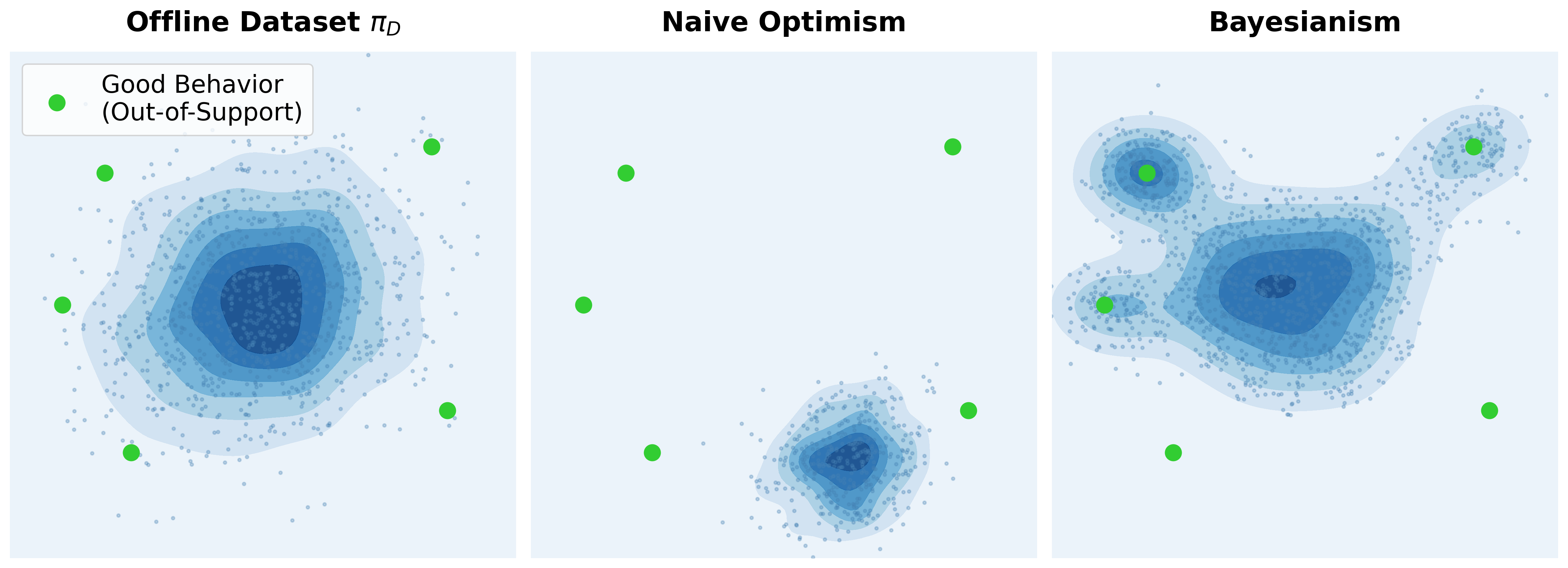 This shift alters what offline RL should optimize for. The central claim of this post is that, rather than collapsing behavior to dataset support, a good policy prior should preserve behavioral flexibility by explicitly accounting for epistemic uncertainty. Outside the dataset, actions are not inherently bad—they are simply uncertain—and prematurely assigning them near-zero probability significantly limits downstream adaptation from discovering and amplifying useful behaviors.