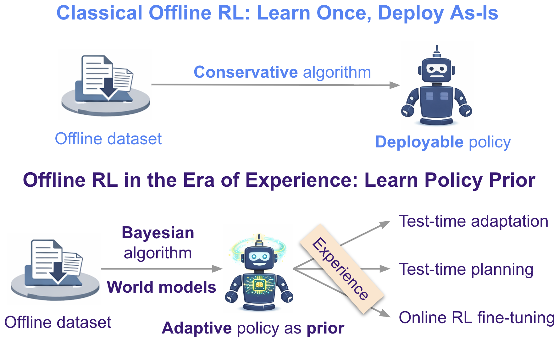 Here, experience encompasses both parameter updates (online RL fine-tuning) and test-time adaptation through in-context learning or planning based on the agent’s own interactions. Importantly, this does not diminish the value of offline learning: offline data provides a crucial prior that absorbs existing knowledge and reduces the sample complexity of subsequent experience. We now examine what properties such a policy prior should have.